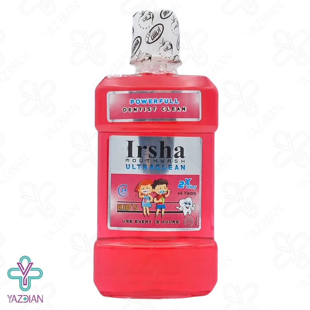 دهانشویه کودک ایرشا Irsha Kids Mouthwash با طعم توت فرنگی یکی از بهترین دهان شویه ها برای کودکان ۶ تا ۱۲ سال بوده و برای سلامت دندان های آنان مفید است. دهانشویه ها برای کنترل پلاک و جلوگیری از تجمع آن روی دندانها و لثه ها استفاده میشوند. مزیت استفاده از دهانشویه فاقد الکل بودن آن است. دهانشویه ایرشا علاوه بر پاکیزگی اثر درمانی دارد و به سلامت دندان کمک میکند.