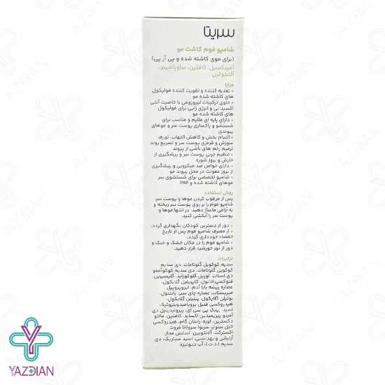 شامپو فوم موهای کاشته شده سریتا دارای ترکیبات لیپوزومی با خاصیت های آنتیاکسیدانی و انرژی زایی برای فولیکولهای کاشته شده مو می باشد. از این رو به علت داشتن خاصیت ضد میکروبی، میتوانید از مبتلا شدن به عفونت در ناحیه پیوند مو جلوگیری کنید.