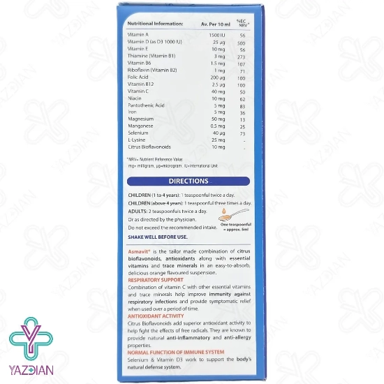 شربت آسماویت به عنوان یک آنتی اکسیدان قوی و طبیعی عمل کرده و با از بین بردن اثرات مخرب رادیکال های آزاد باعث تقویت قدرت تنفس در بزرگسالان و کودکان می شود. همچنین بیوفلاونید های مرکبات با کمک ویتامین C به بهبود و افزایش گردش خون در مویرگ ها و رفع انقباضات نای و نایژه ها کمک بسیاری می کند و به عنوان یک داروی ضد سرفه نیز به کار می رود.