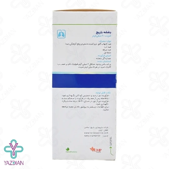 شربت ضد سرفه بنفشه باریج اسانس (Barij Essence Banafsheh Syrup 60 ml) از دسته داروهای ضد سرفه و سرماخوردگی می باشد و با دارا بودن عصاره گل بنفشه و شکر سرخ می تواند سرماخوردگی، تب و سرفه را درمان کند. با مصرف این فرآورده خلط آور، حنجره نرم شده و باعث برطرف شدن گرفتگی صدا نیز می شود.