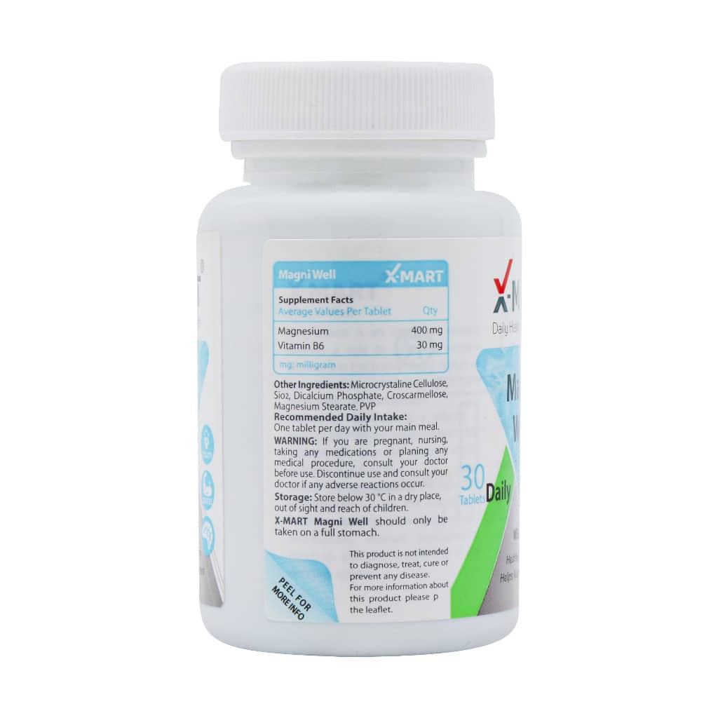 قرص منیزیم ب6 مگنی ول ایکس مارت - 30 عددی (X Mart Magni Well Tablets) با بهره گیری از منیزیم و ویتامین B6 در فرمولاسیون خود، یک مکمل رژیمی غذایی عالی جهت بهبود عملکرد عضلات هم در آقایان و هم در خانم ها می باشد. عملکرد این قرص بدین صورت است که با کاهش میزان اسید لاکتیک بدن، از گرفتگی عضلانی جلوگیری کرده و از خستگی ناشی از تمرینات ورزشی می کاهد. این فراورده تا حد چشمگیری علائم سندرم پیش از قاعدگی را بهبود می بخشد و در کاهش شدت میگرن و بهبود کیفیت خواب موثر واقع می شود.