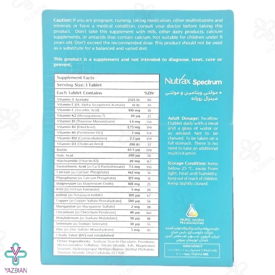 قرص مولتی ویتامین مینرال اسپکتروم نوتراکس حاوی 24 ماده مغذی است که نیازهای بدن به انواع ویتامین ها و مواد معدنی را تامین کرده و فاقد مواد حساسیت زا می باشد.