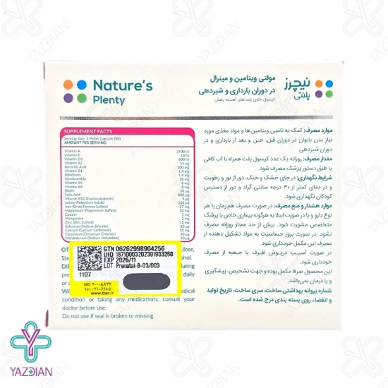 قرص مولتی ویتامین پریناتال نیچرز پلنتی (Multivitamin For Prenatal 100 Natures Plenty) جز دسته داروهای مادر، بارداری و شیردهی بوده و دارای ویتامین های D3، A، E و گروه B بوده و سبب حفظ سلامت مادر، جنین و هم چنین بانوان شیرده می شود.