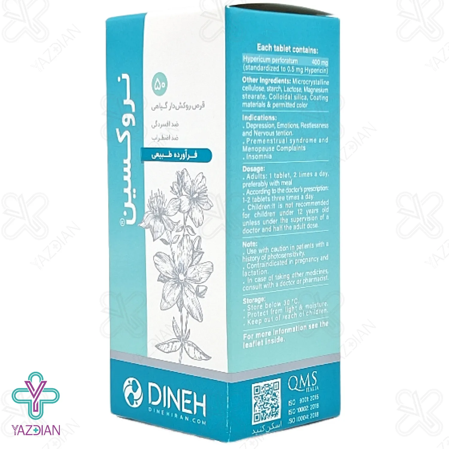 قرص نروکسین دینه یک مکمل گیاهی است که حاوی عصاره علف چای یا همان هایپریکوم پرفوراتوم می باشد.عصاره گیاهی علف چای بیماری افسردگی های خفیف تا متوسط و اختلال اضطراب را کاهش و بهبود میبخشد. طبق تحقیقات انجام شده و نتایجی که به دست آمده، مکانیسم اثرات مفید و موثر عصاره هایپریکوم برای بهبود افسردگی، به علت پیشگیری از بازجذب هورمون سروتونین و تاثیرات آن روی انتقال دهندههای عصبی مثل نوراپی نفرین می باشد. اثرات ضد اضطرابی قرص نروکسین دینه مربوط به عملکرد گیرنده بنزودیازپین می باشد. به همین علت قرص نروکسین دینه باعث کاهش نشانه های اختلالات اضطراب مثل تنش، نگرانی، تحریک پذیری، گرفتگی عضلانی، بی خوابی و دندون قروچه می شود.