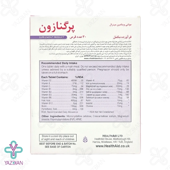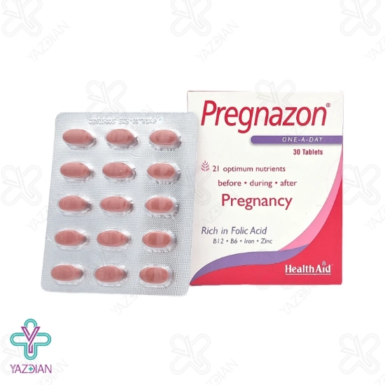 قرص پرگنازون هلث اید (Health Aid Pergnazon 30 Tabs) با دارا بودن 11 نوع ماده معدنی و 12 نوع ویتامین مورد نیاز بدن بانوان باردار و شیرده می تواند 100 درصد نیاز روزانه بدن آنان را نسبت به آهن، روی و اسید فولیک تأمین نماید و سبب تقویت قوای جسمانی زنان باشد. از ویتامین A در این مکمل استفاده نشده است.