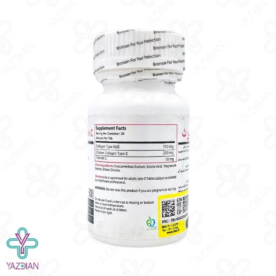 قرص کلاژن ویتامین ث برانسون - 60 عددی (Bronson Collagen + Vitamin C - 60 Tabs) با فرمولاسیون تخصصی ای که دارد، جهت تامین و حفظ سلامت پوست، مو، ناخن و مفاصل طراحی شده است. بدین صورت که ساختار پوست را بهبود می بخشد و خاصیت ارتجاعی آن را زیاد می کند. بعلاوه به دلیل بهره گیری از کلاژن نوع I و III، روند پیری پوست را به تعویق می اندازد و عمق چین و چروکهای پوستی را کم می کند؛ بدین ترتیب باعث افزایش استحکام و جوانسازی پوست می شود.
