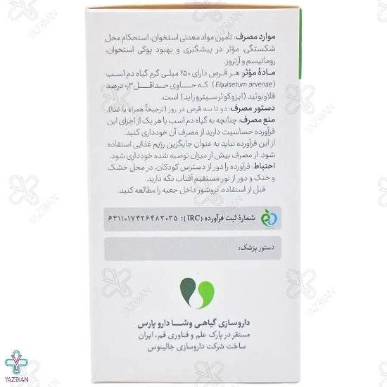 قرص گیاهی تقویت مفاصل اکوئیفلکس وشا دارو( Equiflex) دارای پودر گیاه دم اسب به مقدار 250 میلی گرم بوده و به عنوان منبعی غنی از عناصر معدنی ضروری مفاصل و استخوان ها، از پوکی استخوان جلوگیری کرده و علاوه بر بهبود آرتروز و روماتیسم، موها و ناخن ها را تقویت می کند.