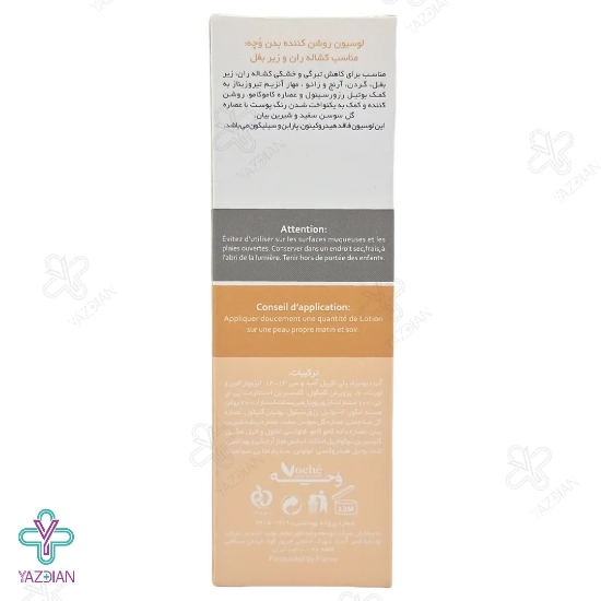 به صورت روزانه صبح ها و شب ها به مقدار کافی از لوسیون روشن کننده بدن وچه voche را روی نواحی تیره بدن مالیده و به آرامی ماساژ دهید.
