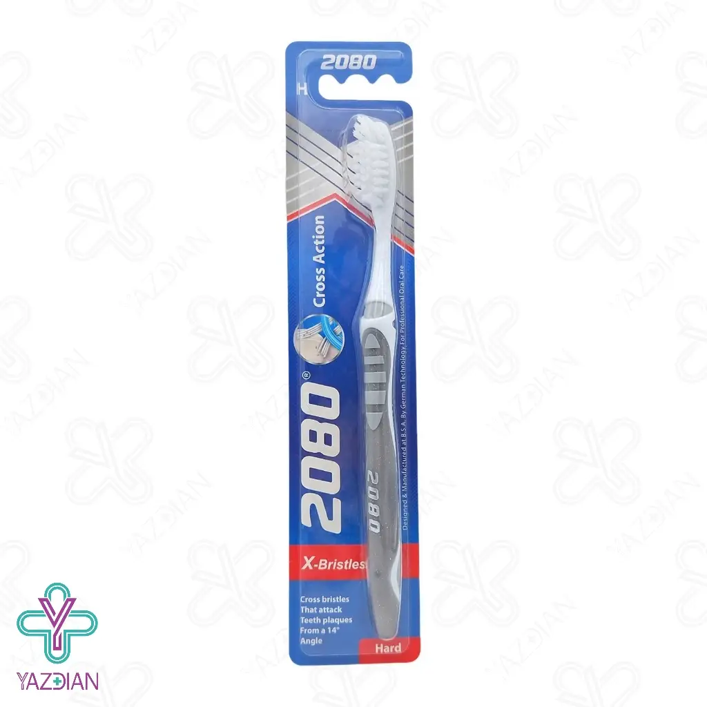 مسواک 2080 مدل Cross Action دارای برسی سخت با نخ های خاص و از جنس نایلون 6.12 می باشد که برای تمیز کردن دندان ها و جلوگیری از ایجاد جرم، محصول مناسبی می باشد.