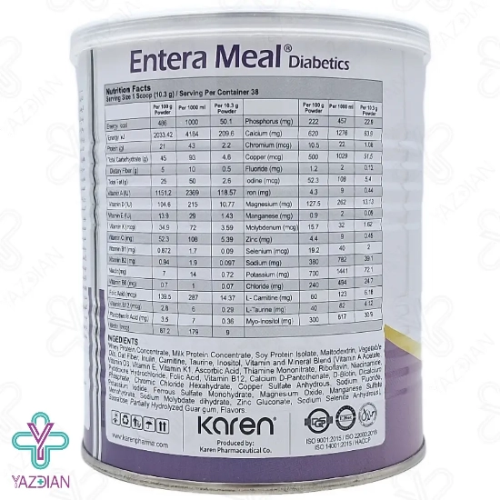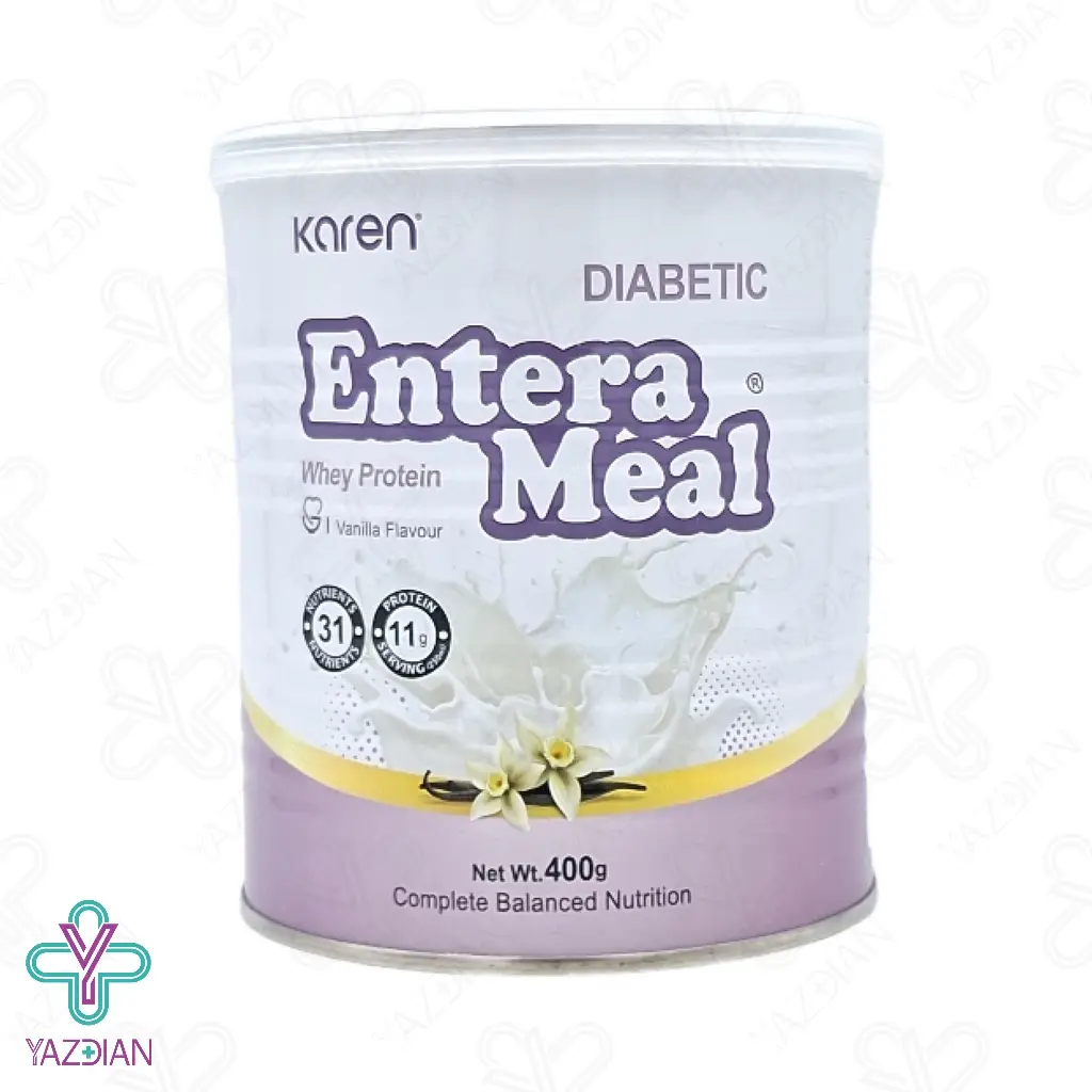 پودر انترامیل دیابتی وانیلی کارن (Karen Entera Meal Diabetic 400 g) یک پودر مکمل غذایی سالمندان و بیماران بوده که سرشار از انواع ویتامین ها و مواد معدنی ضروری بوده و برای افراد دیابتی و افرادی که به عدم تعادل قند خون دچار هستند، مناسب می باشد.