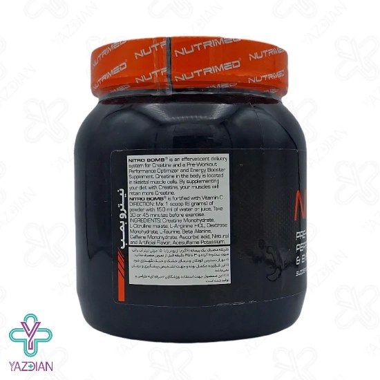 پودر نیترو بمب نوتریمد Nutrimed Nitro Bomb Powder شامل مواد محرک و آمینو اسیدهایی است که باعث افزایش انرژی، پمپاژ خون و قدرت عضلانی میشود. همچنین، این مکمل انرژی زا باعث رشد و ترمیم بافتهای عضلانی، تاخیر در خستگی هنگام تمرینات هوازی، افزایش تعریق و بهبود خون رسانی به بافتهای عضلانی میشود. ترکیبات موجود در نیترو بمب نوتریمد باعث افزایش سطح هورمون رشد نیز میشود.