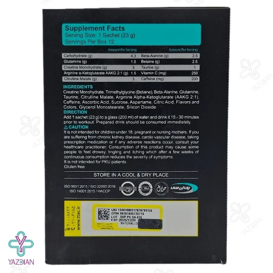 در ترکیبات این مکمل از مقادیر زیادی کربوهیدرات، کراتین منوهیدرات، بتاآلانین، گلوتامین، تائین، تورین، سیترولین مالات، آلفا لیپوئیک اسید، کروم، کافئین و ویتامین C استفاده شده است این پودر را به یک انرژی زای مناسب نیز تبدیل کرده است.