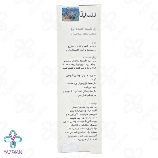 ژل تثبیت کننده ابرو سریتا می تواند تا مدت 24 ساعت ابروان شما را ثابت نگه دارد و به طبیعی و مرتب جلوه دادن آن ها کمک کند. در ترکیبات این محصول از عصاره آلوئه ورا، پروویتامین B5 و ویتامین E استفاده شده است که علاوه بر داشتن خاصیت رطوبت رسانی، تقویت کننده بوده و از ایجاد حساسیت، خشکی و ریزش ابروها جلوگیری می کند.