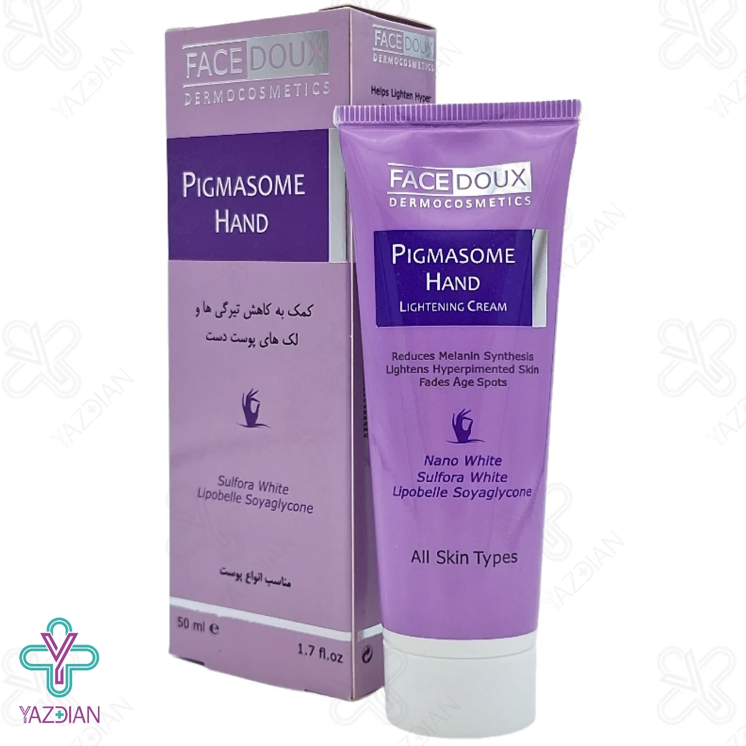 رنگ پوست، حاصل تجمع رنگدانه های ملانین در سلول های پوست است که میزان تولید و نحوه تجمع این رنگدانه ها علاوه بر شرایط ژنتیکی، خصوصیات قومی و نژادی و شرایط سنی، به عوامل محیطی (از قبیل داروهای ضد بارداری)، جراحات پوستی و جوشگاه زخم ها (اسکار) و غیره بستگی دارد. لک های پوستی ناشی از تجمع موضعی رنگدانه های ملانین می باشد که طی یکسری فرایندهای بیو شیمیایی اسید آمینه تیروزین تحت تاثیر آنزیم تیروزینار به رنگدانه ملانین تبدیل می گردد. کرم روشن کننده دست پیگمازوم فیس دوکس محصولی با خواص منحصر به فرد و حاوی آنتی اکسیدان بوده که موجب مهار آنزیم تیروزینار و کاهش تیرگی ها و لک های پوستی می گردد و پوستی شفاف و شاداب برجای می گذارد.
