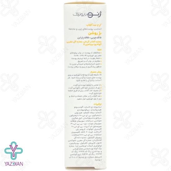 کرم ضد آفتاب ژنوبایوتیک حاوی عصارههای گیاهی است که با کمک پاکسازی پوست می تواند منافذ پوست را از شر آلودگیها و چربیها بازسازی کرده و باعث متعادل نگهداشتن سبوم پوستی گردد.