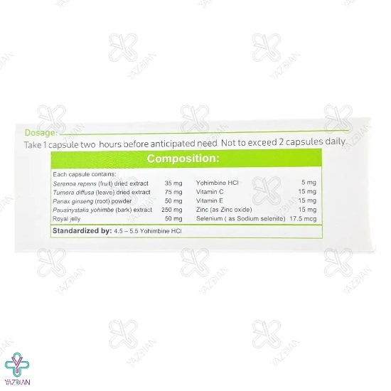 ترکیبات موثر این قرص تقویت جنسی مردان شامل گیاه سبل (یا نخل ارهای) است که کاربردهای درمانی فراوانی دارد و بهبود ناتوانی جنسی یکی از مهمترین آنهاست. از قدیمیترین زمانها از این گیاه برای درمان اختلالات جنسی استفاده میشده است.