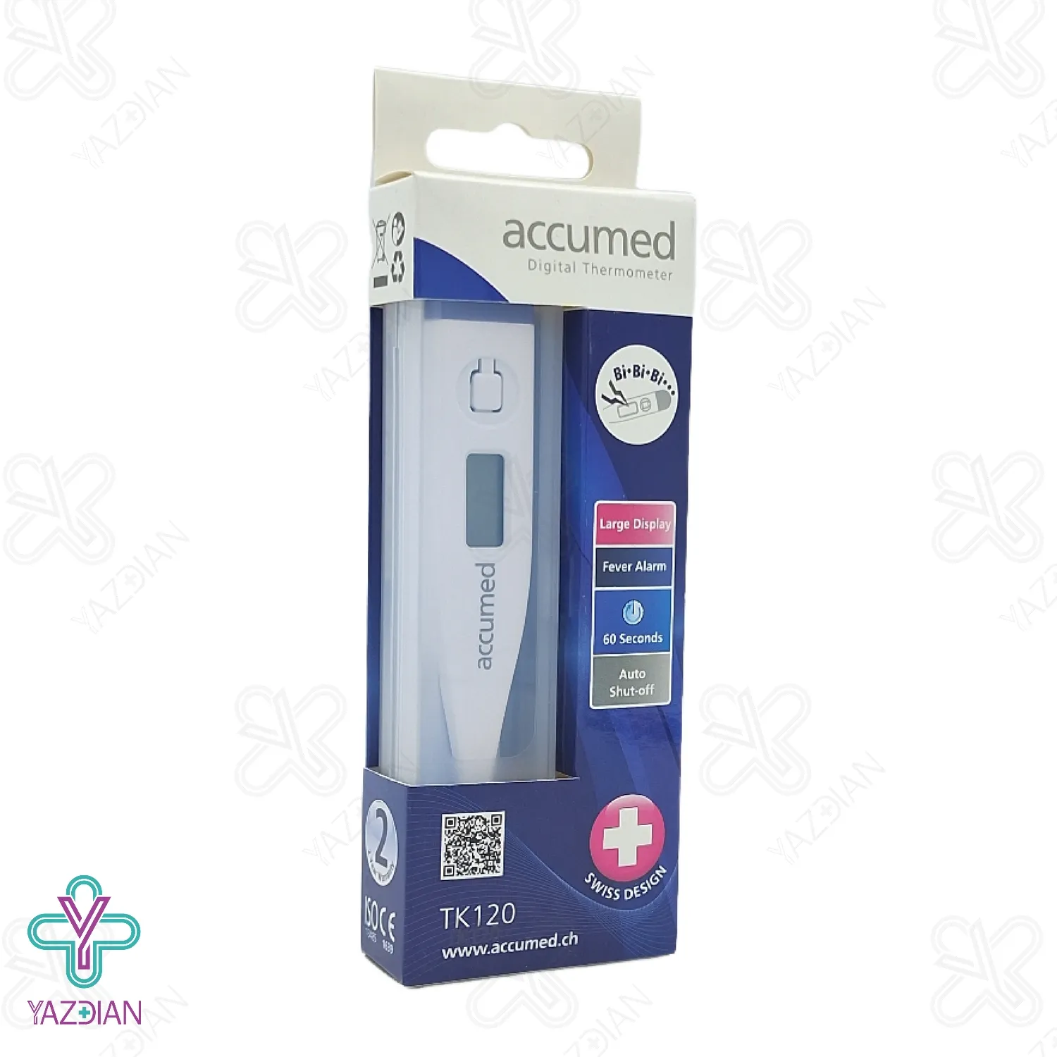 تب سنج دیجیتال آکیومد مدل TK120 (Accumed TK120 Digital Thermometer) با قابلیت اندازه گیری دما هم با کمیت فارنهایت و هم سانتی گراد می باشد. این دستگاه مجهز به سیستم هشدار دهنده می باشد، بدین صورت که اگر دمای بدن بالای 38 درجه باشد، به مدت ده ثانیه به صورت ممتد شروع به آلارم زدن می کند. حال چنانچه دمای بدن پایین 37 درجه باشد، با صدای بوقی متفاوت به شما هشدار می دهد.