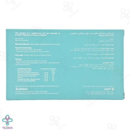 کپسول تقویت و ضدریزش مو گرناهیر پریمیوم آدریان (Adrian Gernahair Premium 30 Oral Capsules) حاوی کراتین، مخمر دارویی، تیامین، سیستئین و کلسیم پالتوتنات می باشد. این قرص تاثیر بسزایی در حفظ سلامت مو ناخن داشته که البته برای کنترل ریزش مو اختصاصی تر است و جز جدیدترین داروهای گیاهی ریزش مو است.