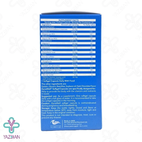 سافت ژل دایناول اروند فارمد (Arvand Pharmed Dyna well soft Gel – 30 pcs) دارای انواع ویتامین ها، مواد معدنی و عصاره های گیاهی است که مواد ضروری مورد نیاز بدن را تامین کرده و موجب حفظ سلامت عمومی بدن می شود، این محصول سیستم ایمنی بدن را تقویت کرده و با تامین انرژی موجب کاهش خستگی و تقویت سیستم عصبی بدن می شود و هم چنین قوای جسمی و جنسی را در آقایان و خانم ها تقویت می کند، سافت ژل دایناول دارای ترکیبات آنتی اکسیدانی می باشد که از سلول های بدن در برابر اثرات مخرب رادیکال های آزاد محافت می کند. عصاره جینسینگ یکی از ترکیبات موجود در این محصول می باشد که موجب تقویت عملکرد ذهنی و جسمی شده و دارای اثرات آنتی اکسیدانی، ضد التهاب و ضد حساسیت نیز می باشد این ترکیب هم چنین ضد سران و ضد دیابت نیز می باشد و موجب تقویت سیستم ایمنی و بهبود حافه نیز می شود، روتین نیز از دیگر ترکیبات موجود در این محصول بوده که دارای خواص آنتی اکسیدانی بوده و هم چنین ضد آلزایمر، ضد خستگی و افسردگی می باشد و موجب بهبود جریان خون شده و از ایجاد لخته های خون پیش گیری کرده و موجب کاهش کلسترول و دردهای آریتمی می شود، لیستین نیز از دیگر ترکیبات موجود در این محصول بوده که موجب کاهش کلسترول، بهبود سلامت قلب و حافظه می شود.