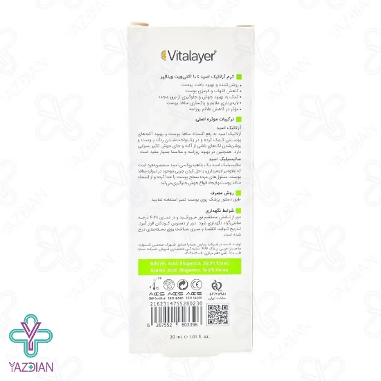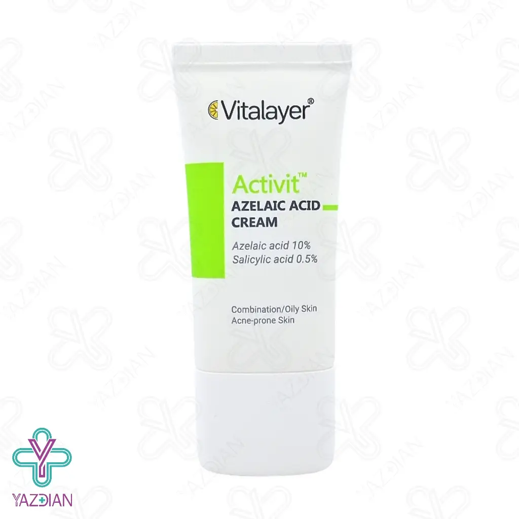 کرم آزلائیک اسید 10% اکتی ویت ویتالایر (Azelaic acid cream 10% activit vitalayer – 30 ml) دارای ترکیبات موثری است که موجب کاهش التهاب، آکنه و روشن شدن پوست می شود این محصول برای پوست های چرب، مختلط و آکنه ای طراحی شده است آزلائیک اسید موجود در این محصول موجب رفع مسدود شدن منافذ پوست شده و تولید چربی اضافه را کاهش می دهد و در نتیجه آکنه های پوستی را بهبود می بخشد و موجب یک نواخت شدن رنگ پوست و روشن شدن لک های ایجاد شده در اثر جای جوش و آکنه شده و در بهبود روزاسه و پلاسما نیز موثر می باشد سالیسیلیک اسید موجود در این محصول موجب لایه برداری ملایم شده و به صورت عمقی در منافذ نفوذ کرده و چربی و سلول های مرده پوست را رفع می کند و با پاک سازی منافذ و جلوگیری از مسدود شدن آن ها از ایجاد جوش جلوگیری می کند نیاسینامید موجود در این محصول موجب کاهش قرمزی و التهاب پوست شده و با بهبود بافت پوست موجب شده تا ظاهری روشن و شفاف داشته باشید و در صورتی که به صورت مداوم از این محصول استفاده کنید ضمن رفع التهاب و جوش موجب روشن، یکنواخت و سالم تر شدن پوست می شود.
