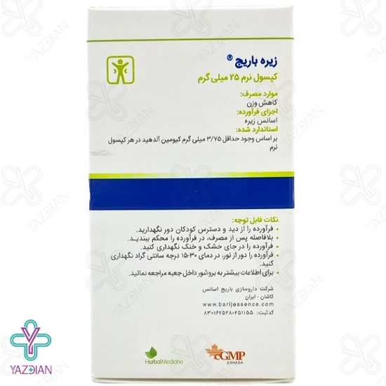 کپسول کاهش وزن زیره 25 میلی گرم باریج اسانس (Barij Essence Cumin 25 mg 60 Capsules) از داروهای گیاهی لاغری قوی بوده و با هدف کاهش اصولی وزن و ثابت نگه داشتن آن تهیه شده است و ضمن برخورداری از خواص ضد نفخ، اشتهای افراد مصرف کننده را کاهش می دهد و بدین گونه وزن آنان را کم کرده و باعث تبیث آن نیز می شود.