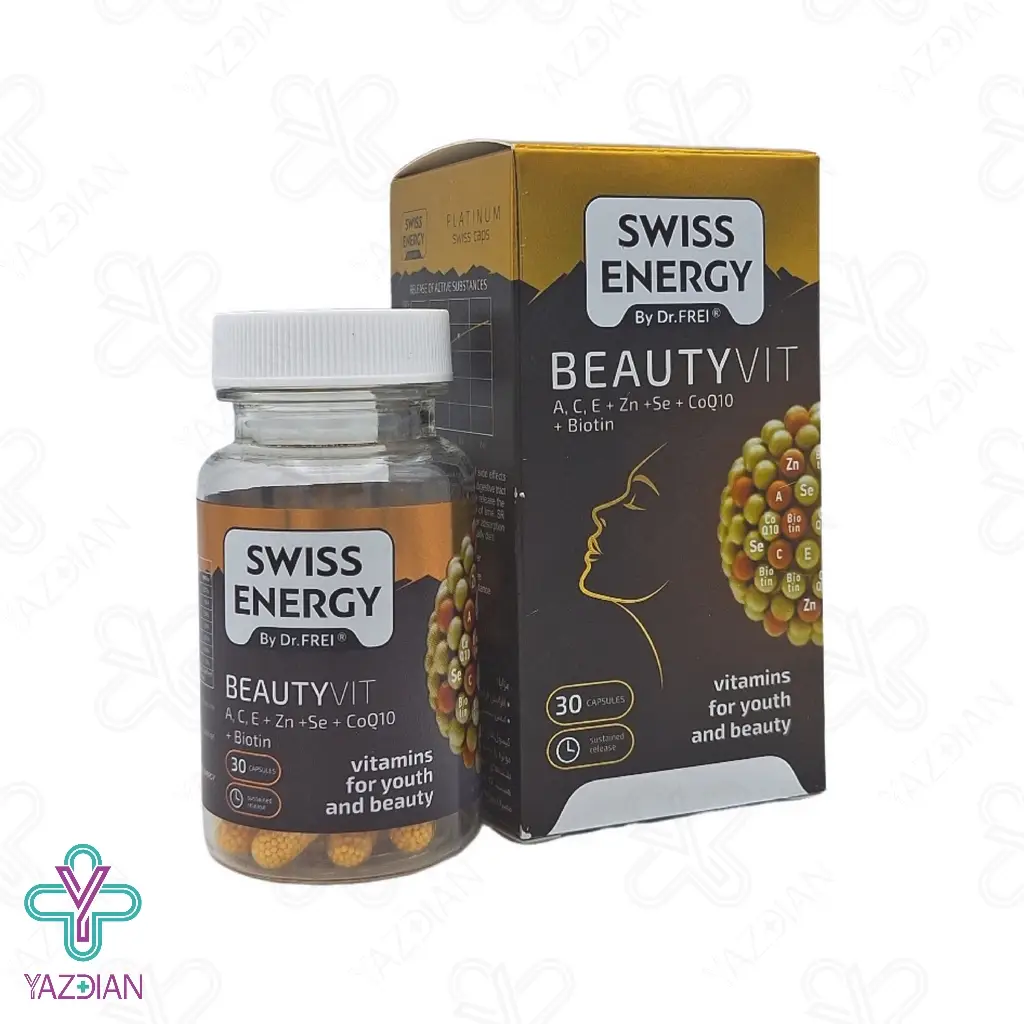 کپسول ضد ریزش مو بیوتی ویت سوئیس انرژی ( Beauty Vit Swiss Energy capsules ) یک مکمل غذایی است که ضمن حفظ سلامت و تقویت پوست موجب تقویت مو و ناخن نیز می شود در این محصول از بیوتین، ویتامین های A،C،E و مینرال های زینک و سلنیوم و کوآنزیم کیوتن استفاده شده است این محصول با خاصیت آنتی اکسیدانی که دارد موجب محافظت سلول ها در برابر آسسیب های ناشی از رادیکال های آزاد می شود کپسول ضد ریزش مو بیوتی ویت موجب تحریک تولید کلاژن و از سلول های پوست حمایت می کند که موجب حفظ شادابی، زیبایی و جوان سازی پوست می شود و هم چنین موجب کند شدن روند پیری پوست می شود این محصول هم چنین موجب تقویت ریشه موها و استحکام آن شده و شکنندگی ناخن ها را کاهش می دهد ویتامین C موجود در این محصول موجب تولید کلاژن شده که موجب افزایش استحکام و خاصیت ارتجاعی پوست می شود ویتامین C دارای خاصیت آنتی اکسیدانی بوده که از پوست در برابر آسیب های ناشی از رادیکال های آزاد محافظت کرده و موجب کاهش چین و چروک پوستی می شود ویتامین E و کوآنزیم Q10 دارای خواص آنتی اکسیدانی بوده که از پوست در برابر آسیب های محیطی محافظت کرده و هم چنین با حفظ رطوبت پوست از خشکی و التهاب آن جلوگیری می کند زینک موجود در این محصول موجب حفظ سلامت فولیکول های مو شده و با تنظیم فعالیت غدد چربی در پوست سر، موجب رشد موهای سالم می شود و از ریزش و ضعیف شدن آن ها جلوگیری می کند بیوتین موجود در این محصول یک ویتامین ضروری برای مو می باشد که موجب تقویت ساختار کراتین موها شده و در استحکام و کاهش شکنندگی آن ها موثر می باشدو با فرآیند متابولیسم پروتئین ها و چربی ها موجب رشد موها می شود.