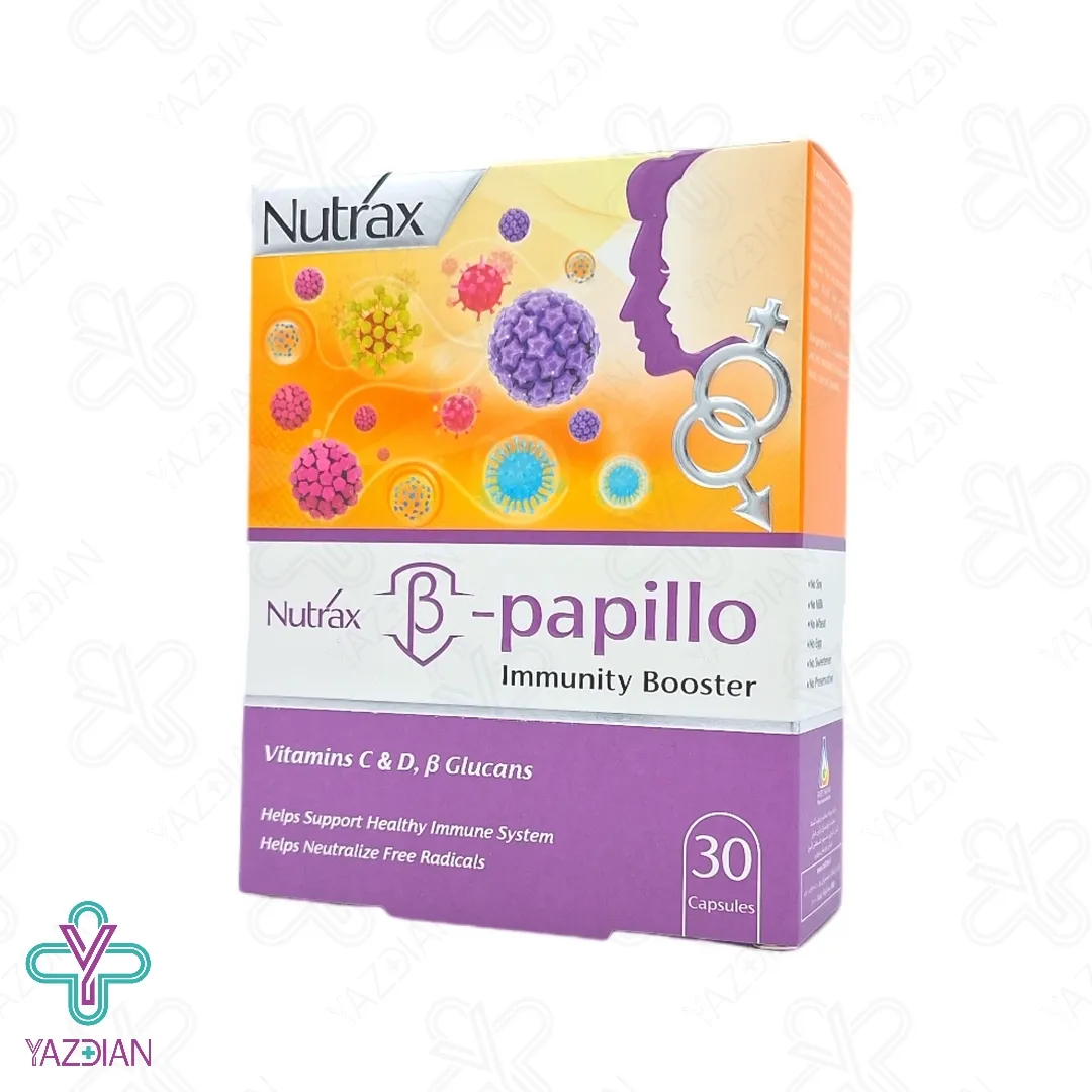 کپسول بتا پاپیلو نوتراکس (Beta Papillo Nutrax capsules – 30 pcs) با دارا بودن ترکیبات موثری که دارد موجب تقویت سیستم ایمنی بدن شده ، این محصول در کاهش علائم بیماری هایی که در اثر نقص سیستم ایمنی بروز می کند نیز موثر می باشد مانند زگیل تناسلی یا پایپلومای انسانی و بیماری های ویروسی مانند سرماخوردگی را به سرعت بهبود بخشیده و طول مدت بیماری را کاهش می دهد، کپسول بتا پاپیلو از انواع ویتامین ها و مواد معدنی تشکیل شده است، ویتامین C از ترکیبات موجود در این محصول می باشد که دارای خواص آنتی اکسیدانی بوده که موجب ترمیم و بازسازی بافت ها شده و از ریه ها در برابر عفونت های تنفسی محافظت کرده و موجب تقویت سیستم ایمنی بدن می شود، بتاگلوکان ها نیز از دیگر ترکیبات این محصول بوده که موجب فعال شدن نوتروفیل ها شده و از بدن در برابر ویروس پاپیلومای انسانی محافظت می کند، عصاره گیاه آقطی سیاه از دیگر ترکیبات این محصول بوده که سرشار از آنتی اکسیدان ها بوده و از بدن در برابر رادیکال های آزاد محافظت می کند و موجب تکین و بهبود عفونت های تنفسی نیز می شود، روی و ویتامین D موجود در این محصول نیز موجب تقویت سیستم ایمنی بدن می شود و از بدن در برابر سرماخوردگی و آنفولانزا به خصوص در فصل سرما محافظت می کند.