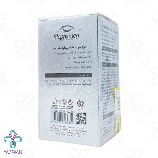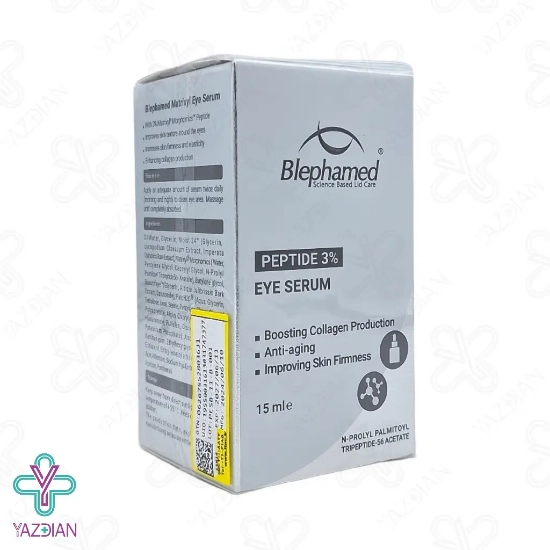 سرم دور چشم پپتید 3 درصد بلفامد (Blephamed peptide eye serum – 15 ml) علائم پیری را کاهش داده و سبب بهبود ظاهر قسمت دور چشم می شود، از دیگر ویژگی های این محصول این است که میزان تولید کلاژن را افزایش داده و به همین دلیل چین و چروک و خطوط ریز نیز کم می شود و در نتیجه پف و تیرگی پوست دور چشم از بین رفته و صاف تر و جوان تر می شود و هم چنین ساختار پوست را تقویت انعطاف پذیری آن را زیاد می کند، این محصول اثرگذاری چشم گیری دارد و پس از مدتی استفاده ی مرتب تغییر بسیار زیادی در ناحیه ی دور چشم خواهید دید، پپتاید ماتریکسیل مورفومیکس از ترکیبات به کار رفته در این سرم است که باعث لیفت دور چشم و هم چنین مانع از افتادگی پوست می شود، سدیم هیالورونات از دیگر ترکیبات موجود در این محصول بوده و از آن جایی که پوست دور چشم بدون غدد چربی است و به شدت در معرض خشکی قرار دارد این ترکیب موجب آب رسانی و حفظ رطوبت در این قسمت می شود، وجود پتنت که سد دفاعی پوست را احیا و بازسازی می کند نیز در این محصول وجود دارد.
