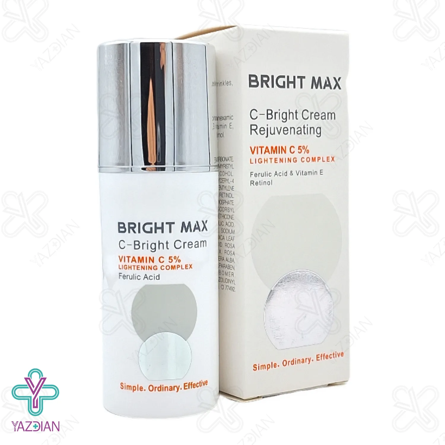 کرم جوان کننده صورت و گردن ویتامین ث برایت مکس (Bright Max C Bright cream - 30 ml) با ترکیبات موثری که دارد ضمن روشن شدن پوست موجب کاهش پیری پوست شده و لک های تیره پوست را نیز رفع کرده و موجب استحکام پوست می شود این محصول با ترکیبات سبکی که دارد زود در پوست جذب شده و میزان رطوبت پوست را افزایش می دهد و لایه محافظ پوست را آب رسانی و ترمیم می کند ویتامین سی موجود در این محصول عملکرد آنزیم تیروزینار را مهار کرده و در نتیجه از سنتز ملانین جلوگیری می کند و موجب بهبود لک های پوستی می شود این محصول با ترکیبات آنتی اکسیدانی مانند فرولیک اسید و ویتامین E از ایجاد لک جلوگیری کرده و مانع از اثرات مخرب رادیکال های آزاد بر روی پوست می شود رتینول موجود در این محصول موجب تحریک ساخت کلاژن شده و خطوط ریز پوست را کاهش می دهد و موجب شادابی و شفافیت پوست می شود و هم چنین دارای کمپلکس درماوایت نیز می باشد کرم جوان کننده برایت مکس مناسب انواع پوست بوده و با دارا بودن ترانگزامیک اسید مانع از تولید ملانین شده و لک های ایجاد شده در اثر آکنه را نیز رفع می کند.