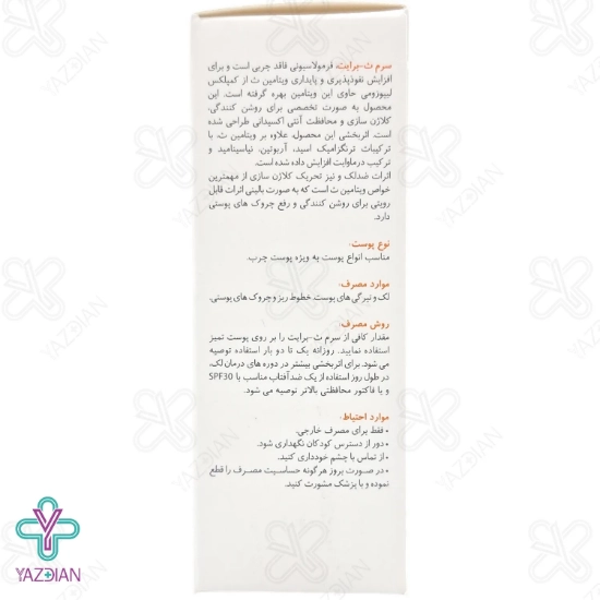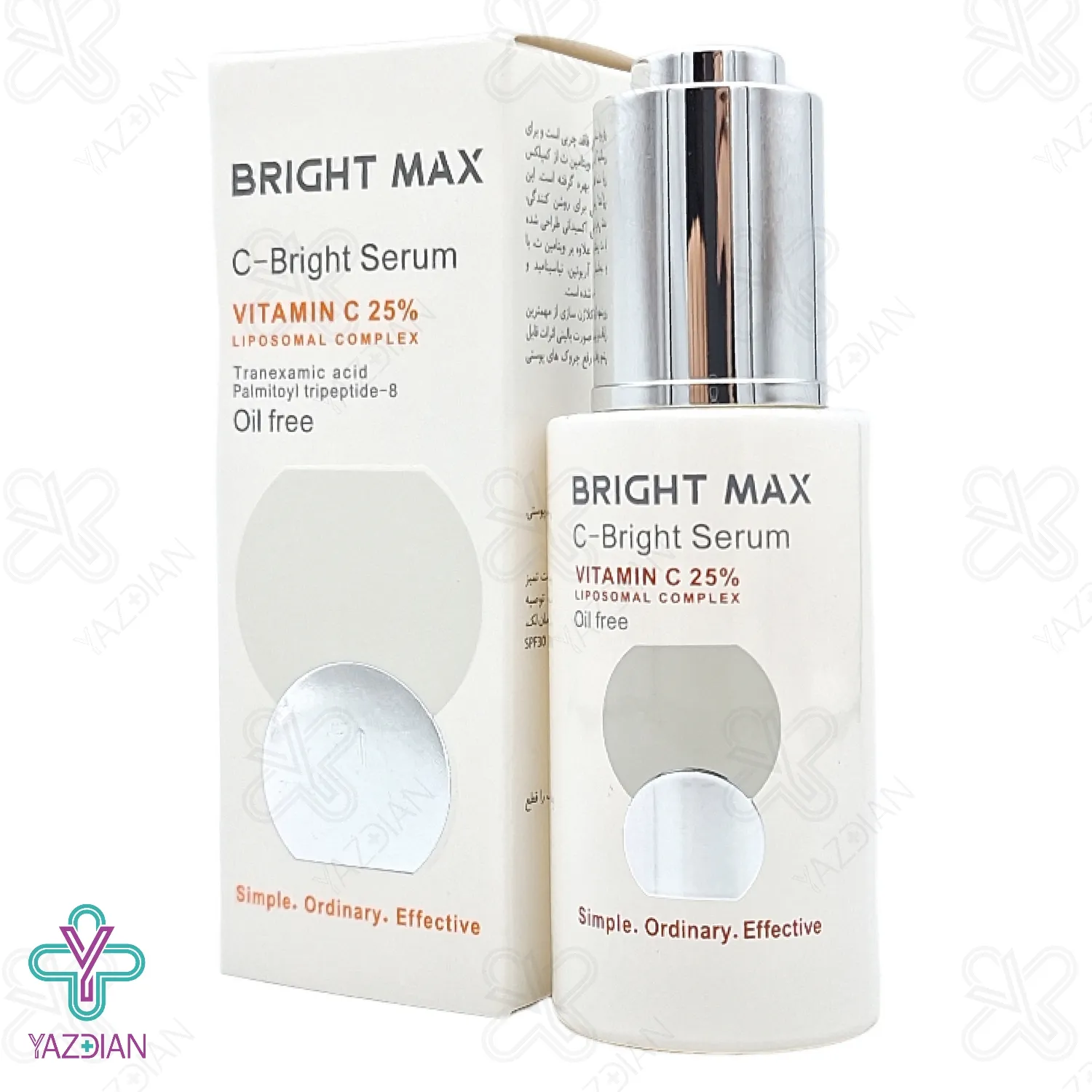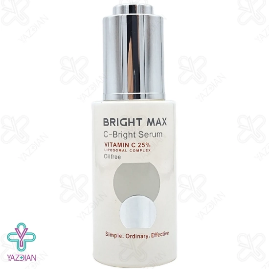 سرم ویتامین ث لیپوزومال 25 درصد برایت مکس - 30 میلی لیتر (Bright Max C Bright Vitamin C 25% Serum 30 Ml) با بهره گیری از مقادیر بالای ویتامین سی در فرمولاسیون خود، خاصیت آنتی اکسیدانی قدرتمندی پیدا کرده است که از پوست در برابر تشعشعات مضر و آلاینده های مسبب پیری زودرس پوست محافظت می کند. این سرم با بهره گیری از تکنولوژی لیپوزوم مقادیر زیادی از ویتامین ث را به لایه های عمقی پوست با اثر بخشی بالا منتقل می کند. ویتامین سی در کنار ترنگزامیک اسید و فرولیک اسید، از تخریب کلاژن و چربی طبیعی پوست جلوگیری کرده و در از بین بردن چین و چروک های پوستی نقش ایفا می کند.