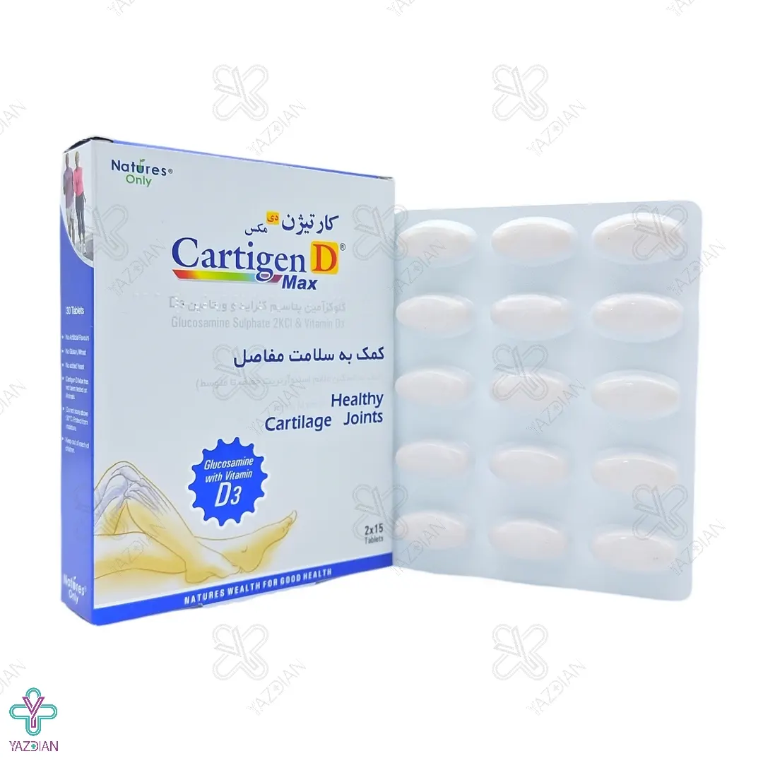 قرص تقویت مفاصل کارتیژن دی مکس نیچرز اونلی (Natures Only Cartigen D Max) به علت داشتن ویتامین د۳ و گلوکزامین باعث تقویت و بهبود عملکرد مفاصل شده و از ساییدگی در بین مفاصل و بروز بیماری آرتروز جلوگیری می کند. اصولاً با تخریب سطح مفاصل درد پدیدار میشود و میتواند باعث تغییر شکل در مفاصل شود و محدودیت حرکتی ایجاد کند، که همه ی این علائم نشانه های بیماری آرتروز می باشد.
