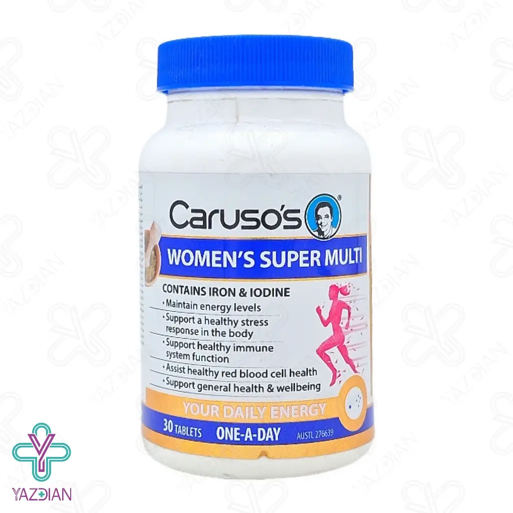 قرص مولتی ویتامین بانوان کارسوس نچرال هلث - 30 عددی (Carusos Natrual Health Womens Super Multi 30 Tablets) یکی از بهترین دارو های تقویتی بدن می باشد که با برخورداری از ویتامینها و مواد معدنی ضروری در فرمولاسیون خود، در بهبود عملکرد سیستم ایمنی بدن نقش موثری داشته و مقاومت بدن در برابر میکروب ها و عوامل بیماری زا را بالا می برد. بعلاوه این ترکیبات خاصیت آنتی اکسیدانی قدرتمندی هم دارند که از آثار مخرب عوامل استرس اکسیداتیو بدن را ایمن می سازند. همچنین تقویت کننده و حافظ سلامت پوست، مو و ناخن بوده و بطور کلی حافظ سلامت عمومی بدن می باشد.