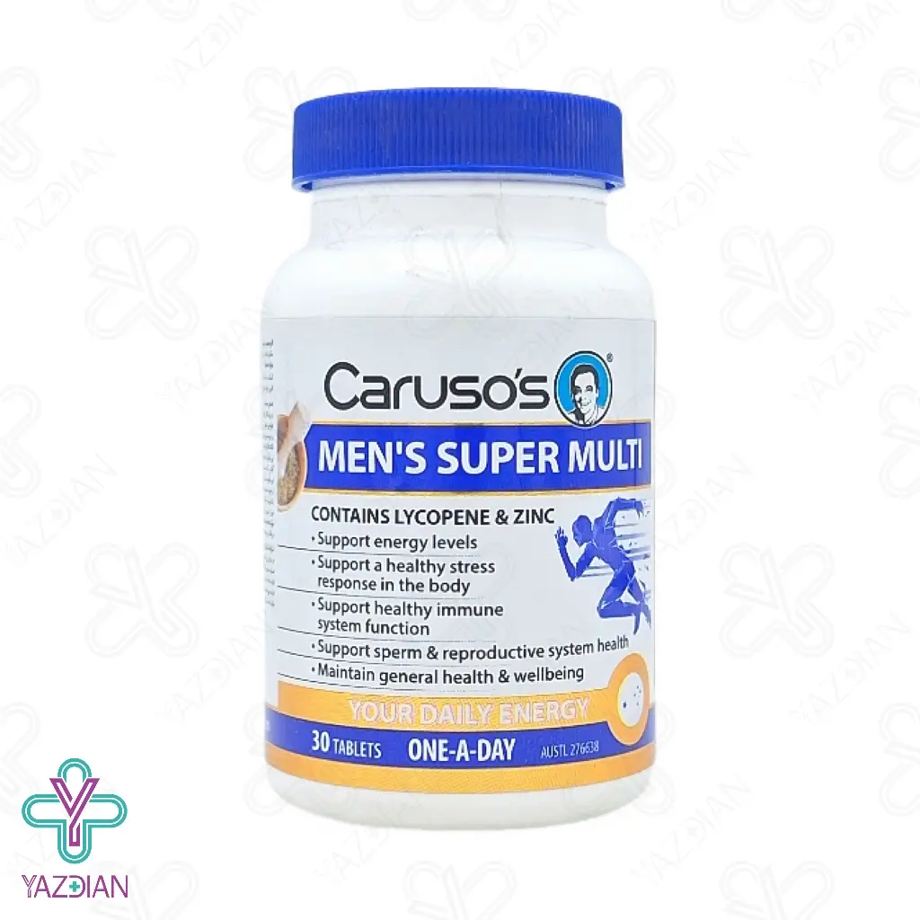 بدن برای آن که بتواند عملکرد طبیعی داشته باشد نیاز به ویتامین ها و مواد معدنی دارد که نقش حیاتی به عهده دارند و کمبود هر کدام در بدن موجب بروز مشکلاتی می شود، تغذیه نیز به تنهایی پاسخگوی نیاز بدن نمی باشد بنابراین باید ویتامین ها مورد نیاز بدن را از طریق مکمل ها تامین کرد، قرص مولتی ویتامین آقایان کاروسوس نچرال هلث (Carusos natural health men multivitamin tablet – 30 pcs) با دارا بودن ترکیبات موثر و فعال موجب رفع خستگی و افزایش انرژی در آقایان می شود، این محصول با دارا بودن ویتامین ها و مواد معدنی موجب تقویت سیستم ایمنی بدن شده و هم چنین قوای جنسی آقایان را تقویت می کند و ضمن حفظ سلامت عمومی بدن موجب کاهش استرس و اضطراب می شود، در این محصول از مواد نگه دارنده و طعم دهنده های مصنوعی استفاده نشده است از همین رو عوارض جدی به همراه نخواهد داشت، ویتامین D ،C و زینک از ترکیبات موجود در این محصول می باشد که موجب تقویت سیستم ایمنی بدن می شود، ویتامین های گروه ب و فوایک اسید با کاهش سطح هموسیستئین در خون موجب کاهش خطر بیماری های قلبی می شود و منیزیم موجود در آن موجب کاهش خستگی و افزابش انرژی شده و لیکوپن و سلنیوم موجود در آن موجب حفظ سلامت پروستات می شود، این محصول با دارا بودن بیوتین و ترکیبات آنتی اکسیدانی خود موجب حفظ سلامت پوست و مو می شود.