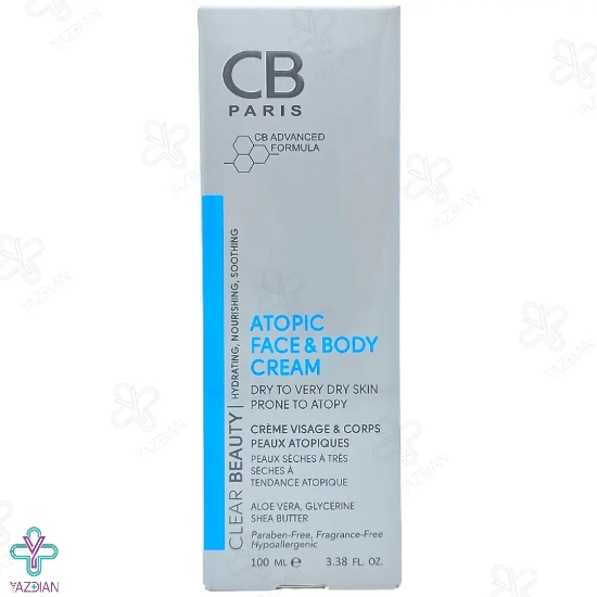 کرم مرطوب کننده صورت و بدن مناسب پوست خشک و خیلی خشک سی بی پاریس (Cb Paris Atopic Face and Body Cream 100 ml) پوست را به مدت طولانی مرطوب نگه می دارد. در این محصول از ترکیبات موثر و مفیدی مثل آلوئه ورا، گلیسیرین و شی باتر استفاده شده است که سبب تقویت و تغذیه ی پوست می شود.