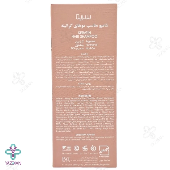 شامپو بدون سولفات کراتینه سریتا (Cerita Keratin Hair Shampoo 200 ml) با بهره گیری از ترکیباتی مؤثر نظیر آرژنین، سدیم PCA، پانتنول و عصاره های گیاهی در فرمولاسیون خود می تواند مواد کراتین مو را در موهای کراتینه و بوتاکس شده ثابت نگه دارد و به نرمی، لطافت و درخشندگی تارهای مو بیفزاید.