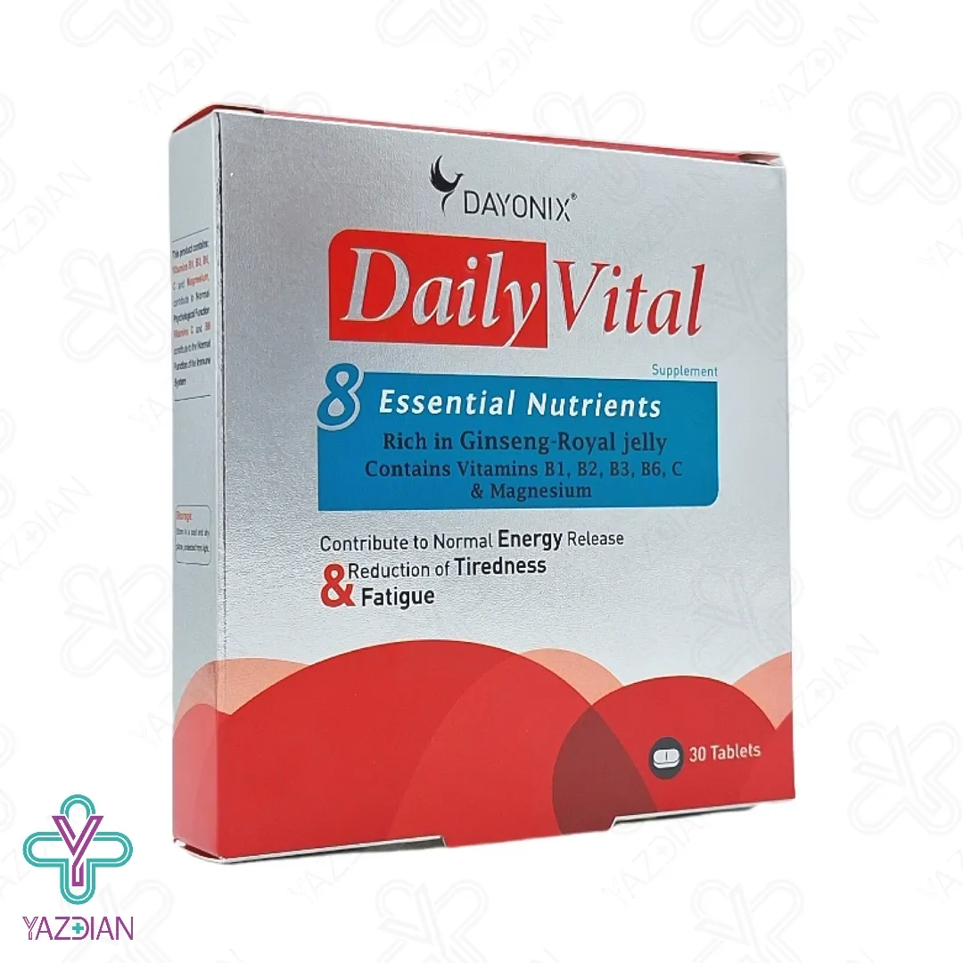 قرص مولتی ویتامین دیلی ویتال دایونیکس فارما - 30 عددی (Dayonix Pharma Daily Vital ۳۰ Tabs) یکی از بهترین مولتی ویتامین های موجود در بازار می باشد که با بهره گیری از رویال ژلی، گیاهان جینسینگ، منیزیم، ویتامین C و ویتامینهای گروه ب، کمک به تقویت سیستم ایمنی و قوای جسمی و ذهنی فرد می کند. این قرص توسط شرکت الحاوی تحت لیسانس دایونیکس فارما انگلستان می باشد که فرمولاسیون فوق العاده با کیفیت و خاصی دارد.