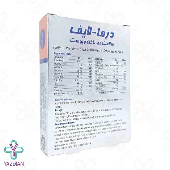 موی سر امکان دارد به دلیل بی توجهی و مصرف برخی غذاها نازک شده و بریزد به همین دلیل استفاده از یک محصول مناسب برای رفع این مشکل توصیه می شود، قرص تقویت مو درما لایف لایف آن (Derma life life on hair strengthening pill – 30 pcs) برای برطرف شدن کمبودهای غذایی به منظور درمان سلامت و زیبایی پوست، مو و ناخن استفاده می شود، از دیگر ویژگی های این محصول این است که از ریزش مو پیشگیری کرده و باعث افزایش رشد مو، استحکام و تقویت ساقه ی مو می شود، این قرص از خشکی و شکنندگی ناخن ها که به دلیل کمبود آهن و ویتامین ب است جلوگیری کرده و موجب رشد و استحکام ناخن ها می شود، این محصول هم چنین با افزایش کلاژن سازی در پوست مانع از به وجود آمدن چین و چروک و پیری زودرس پوست می شود، وجود سلنیوم، منگنز، ویتامین سی و ای و عصاره ی هسته ی انگور در این قرص به دلیل داشتن خواص آنتی اکسیدانی موثر و قوی در خود از پوست و مو در مقابل رادیکال های آزاد حفاظت کرده و هم چنین باعث رشد فولیکول مو می شود و با تحریک سنتز کلاژن به بهبود زخم کمک می کند، زینک و آهن نیز ناخن را استحکام می بخشد و منیزیم هم آب رسانی به پوست را افزایش داده و التهابات پوستی را کاهش می دهد.