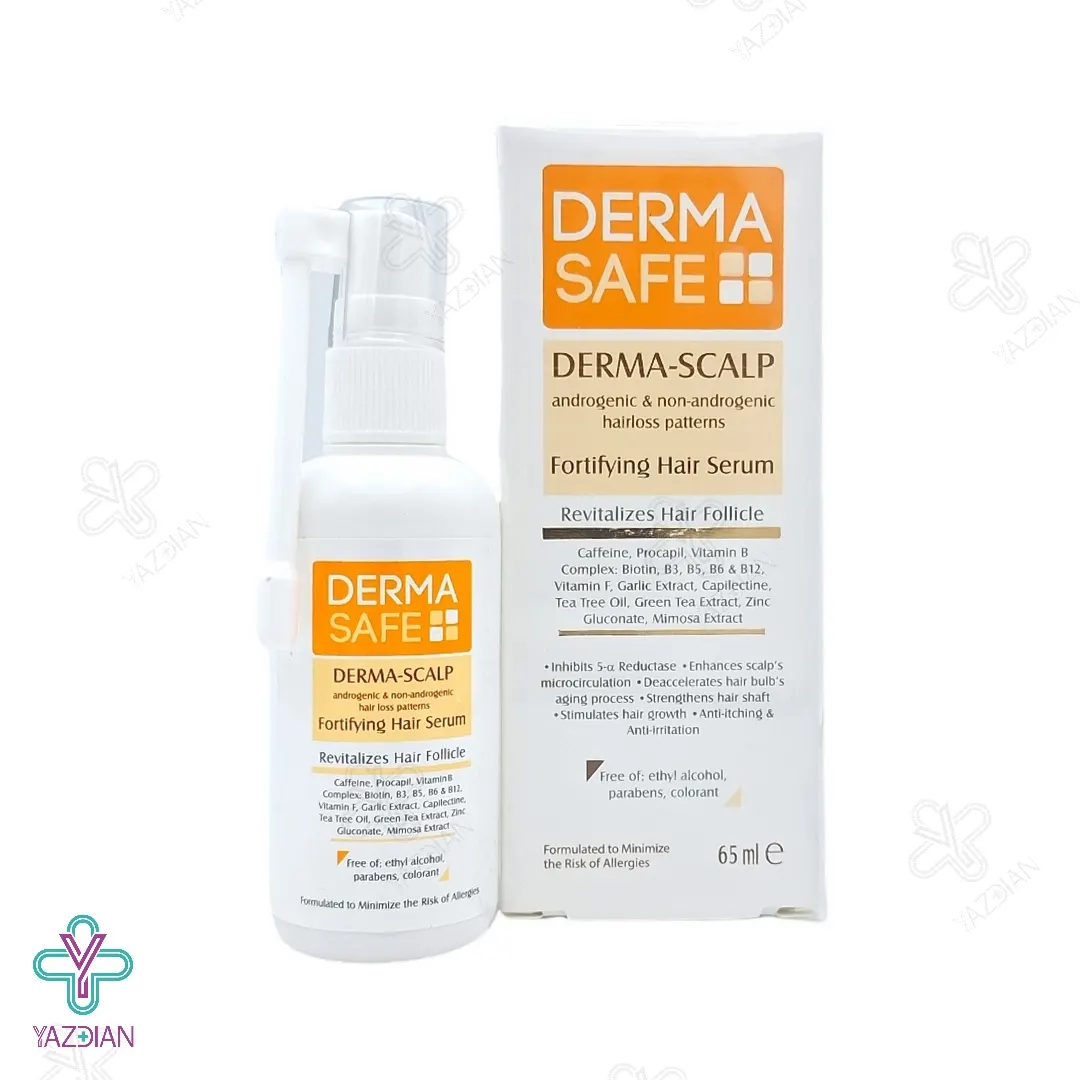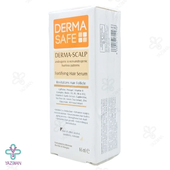 سرم تقویت کننده موی سر درماسیف - 65 میلی لیتر (Derma Safe Scalp Fortifying Hair Serum 65ml) از دسته محصولات مراقبت از مو می باشد که با برخورداری از ترکیبات هدفمند از جمله روغن و عصاره های گیاهی ویتامین های گروه ب می باشد که از انواع الگوهای ریزش مو (آندروژنیک و غیر آندروژنیک) جلوگیری کرده و فعالیت آنزیم ۵_آلفا ردوکتاز را متوقف می کند. این محصول با تحریک و افزایش خون مویرگی فولیکول ها، ریشه موها را تقویت و تغذیه رسانی کرده و محرک رشد موهاست. ضمنا خاصیت ضد شوره ای نیز دارد و با خاصیت آنتی اکسیدانی نیز فعالیت رادیکال های آزاد را خنثی می کند.