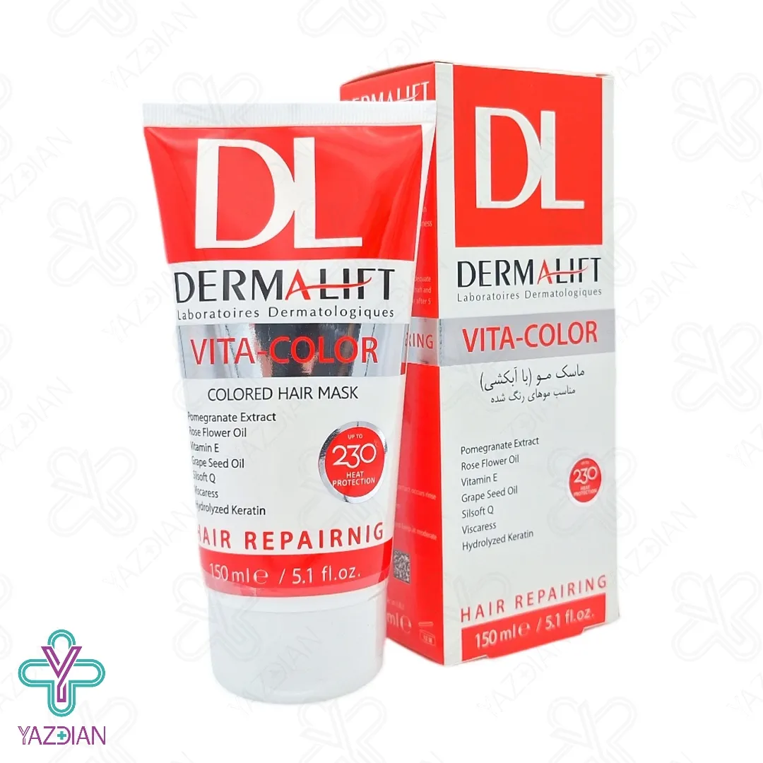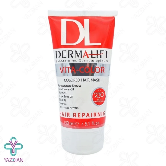 ماسک مو های رنگ شده ویتا کالر درمالیفت (با آبکشی) - 150 میلی لیتر (Dermalift Vita Color Hair Mask ۱۵۰ ml) با فرمولاسیون ویژه و موثر خود، ثبات و ماندگاری رنگ مو ها را دو چندان می کند و مانع از کدری و رنگ پریدگی می شود. این ماسک مو با ایجاد یک لایه محافظتی گسترده روی موها، عوارض و آسیب های ناشی از دکلره را به حداقل مقدار خود می رساند و مقاومت مو ها را در برابر استفاده از وسایل حرارتی مثل اتو مو، سشوار و ... بالا می برد.