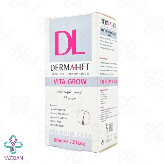 لوسیون تقویت کننده موی سر آقایان ویتا گرو درمالیفت - 60 میلی لیتر (Dermalift Vita Grow Hair Men Fortifying Lotion ۶۰ Ml) از دسه محصولات مراقبت از مو می باشد که با بهره گیری از موثرترین و به روز ترین فرمولاسیون، فولیکول های ضعیف و آسیب دیده را تقویت و تغذیه رسانی می کند و با ایجاد تعادل در میزان ترشح چربی از غدد چربی سر، از ریزش موی سر در اثر علل مختلف پیشگیری می کند. این لوسیون سبب افزایش ضخامت تار های مو می شود و به آن ها استحکام و قوام بیشتری می بخشد.