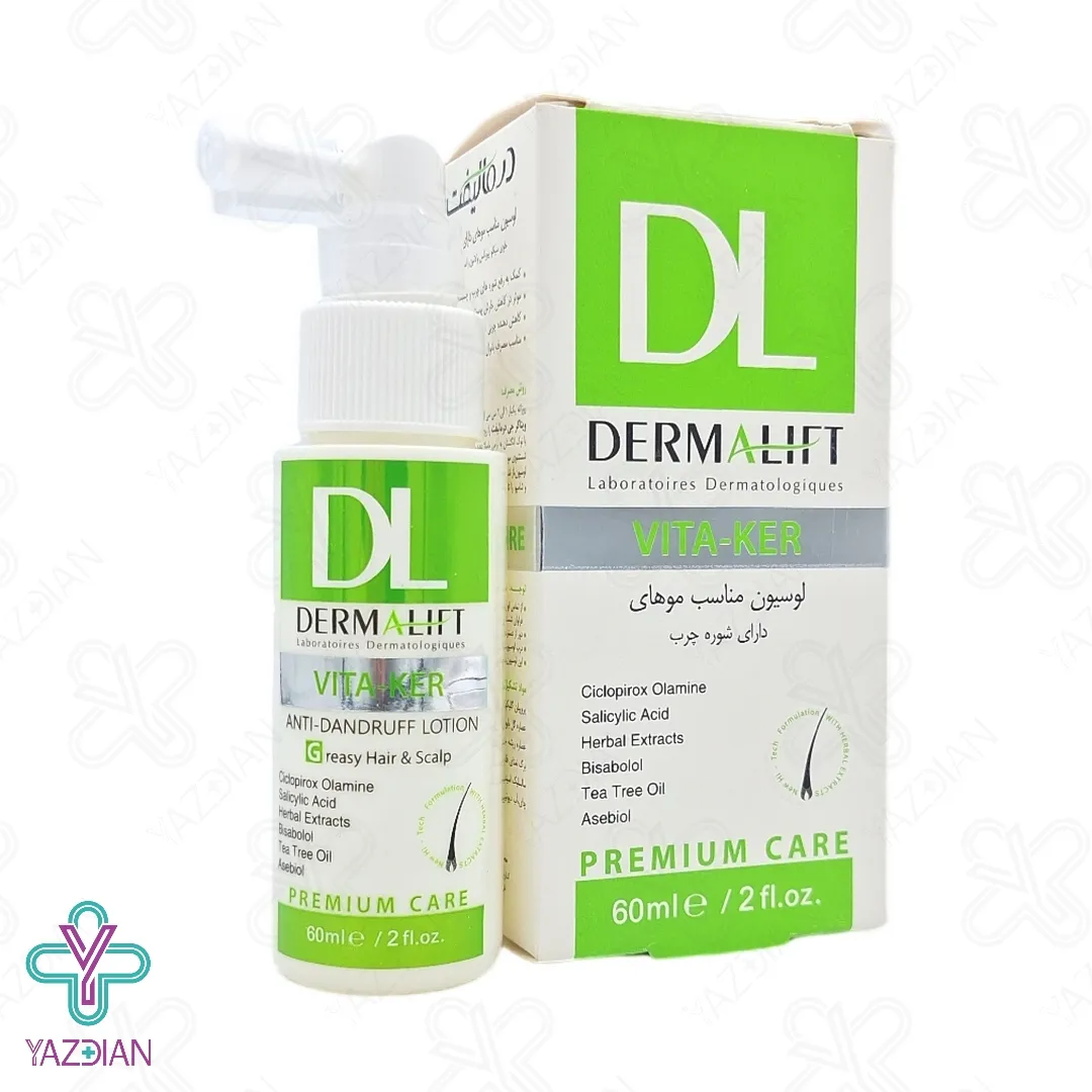لوسیون ضد شوره چرب ویتاکر درمالیفت - 60 میلی لیتر (Dermalift Vita Ker Greasy Anti Dandruff Lotion ۶۰ ml) با بهره گیری از ترکیبات مفید و موثر از جمله سیکلو پیروکس اولامین و سالیسیلیک اسید، به خوبی شوره های چرب سر را از بین می برد و حافظ زیبایی و سلامت مو هاست. این لوسیون حاوی ترکیبات با خاصیت ضد قارچی و ضد باکتریایی می باشد که شوره های مقاوم به درمان را نیز از بین می برد و خارش و التهابات ناشی از شوره را نیز تسکین می بخشد. ویژگی های منخصر به فرد این لوسیون، این محصول را به یک محصول مراقبت از مو تخصصی تبدیل کرده است.