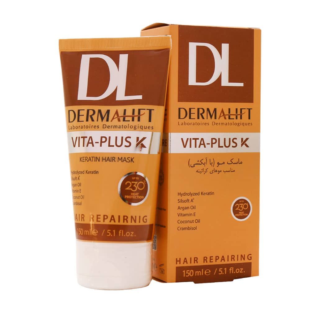 ماسک مو کراتینه ویتا پلاس کی درمالیفت (Dermalift Vita Plus K Keratin Hair Mask 150 ml) از موهای کراتینه در مقابل آسیب های شیمیایی حفاظت می کند. این محصول تارهای آسیب دیده ی مو را ترمیم و احیا کرده و با به وجود آوردن لایه ای محافظ بر روی تارهای مو از تخریب آن در مقابل انواع آسیب ها جلوگیری می کند.