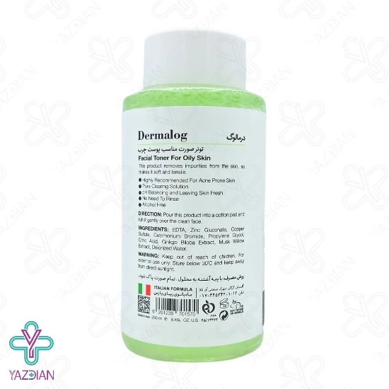 پوست صورت به علت قرار گرفتن در معرض انواع آلودگی ها نیاز به مراقبت دارد، آب به تنهایی موجب پاک سازی پوست نمی شود و تمام آلودگی هایی که در منافذ پوست تجمع یافته را نمی تواند پاک کند،این آلودگی ها موجب تغییر PH پوست شده و به آن آسیب می زند تونر پاک کننده صورت پوست چرب درمالوگ (Dermalog oily skin cleansing Toner – 250 ml) منافذ پوست صورت را از انواع آلودگی ها و مواد آرایشی پاک سازی می کند، از دیگر ویژگی های این محصول این است که میزان تولید چربی در پوست را تنظیم و سبب کوچک شدن منافذ آن می شود، این تونر برای پوست های چرب مناسب بوده و موجب آب رسانی و مرطوب شدن پوست می شود و هم چنین پس از مصرف نیازی به شست و شو با آب ندارد، در این محصول پارابن و الکل به هیچ عنوان به کار نرفته است به همین دلیل هیچ نوع حساسیتی در پوست به وجود نمی آورد و نیز متعادل کننده ی PHپوست است، این تونر میزان انعطاف پذیری پوست را افزایش داده و تازگی و طراوت را در آن به وجود می آورد، عصاره ی بید از ترکیبات به کار رفته در این محصول است که التهاب پوست را بسیار کاهش می دهد، عصاره ی جینکوبیلوبا از دیگر ترکیبات موجود در این تونر بوده و از پیری زودرس پوست جلوگیری می کند.