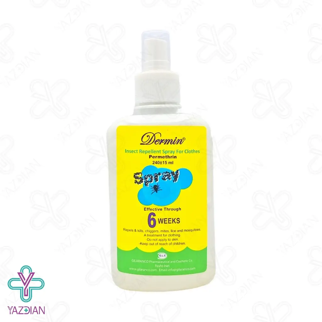 اسپری دافع حشرات البسه پرمترین درمین - 240 میلی لیتر (Dermin Insect Repellent Spray) در واقع یک محصول با خاصیت پیشگیرانه است که پیش از قرار گیزی در برابر حشرات موذی، آن را روی لباس اسپری کرده و با اطمینان خاطر می توان به کار های روزمره خود بپردازید. اگر چه این اسپری تا حدودی خاصیت کشندگی حشرات را دارد، ولی نمی توان آن را یک حشره کش نامید چرا که اکثریت حشره کش های بازار برای انسان مضر می باشد.