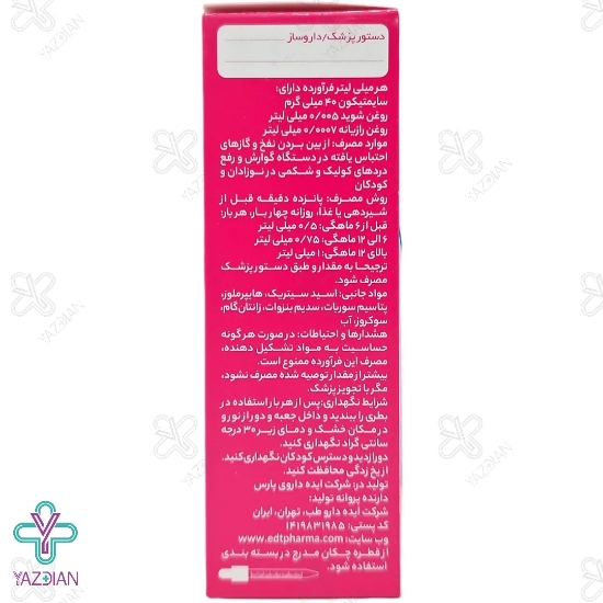 این قطره حاوی سایمتیکون است و به همین دلیل گزینه مناسبی به عنوان دارو برای دل درد کودکان به شمار می آید. این قطره با بهره گیری از عصاره گیاهانی مثل شوید و رازیانه در بهبود درد های دستگاه گوارش در کودکان اثربخشی بالایی دارد.