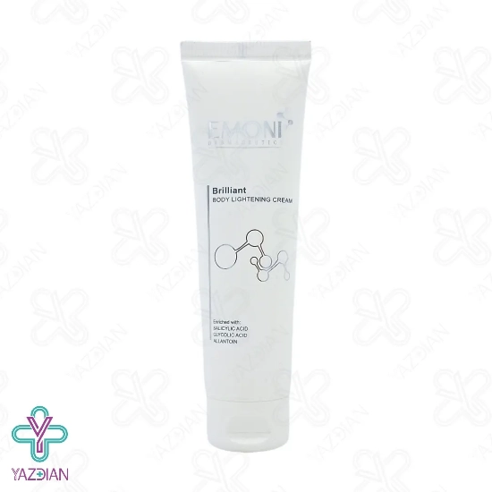 کرم روشن کننده بدن امونی - 100 میلی لیتر (Emoni Body Lightening Cream ۱۰۰ ml) از بین برنده عالی تیرگی های پوست به خصوص در ناحیه زیر بغل و کشاله ران می باشد. این کرم روشن کننده پوست قابل استفاده برای تمامی پوست ها می باشد و توصیه می شود 30 دقیقه پس از شستشوی ناحیه مورد نظر استعمال شود.