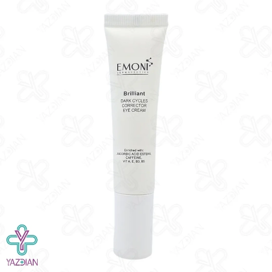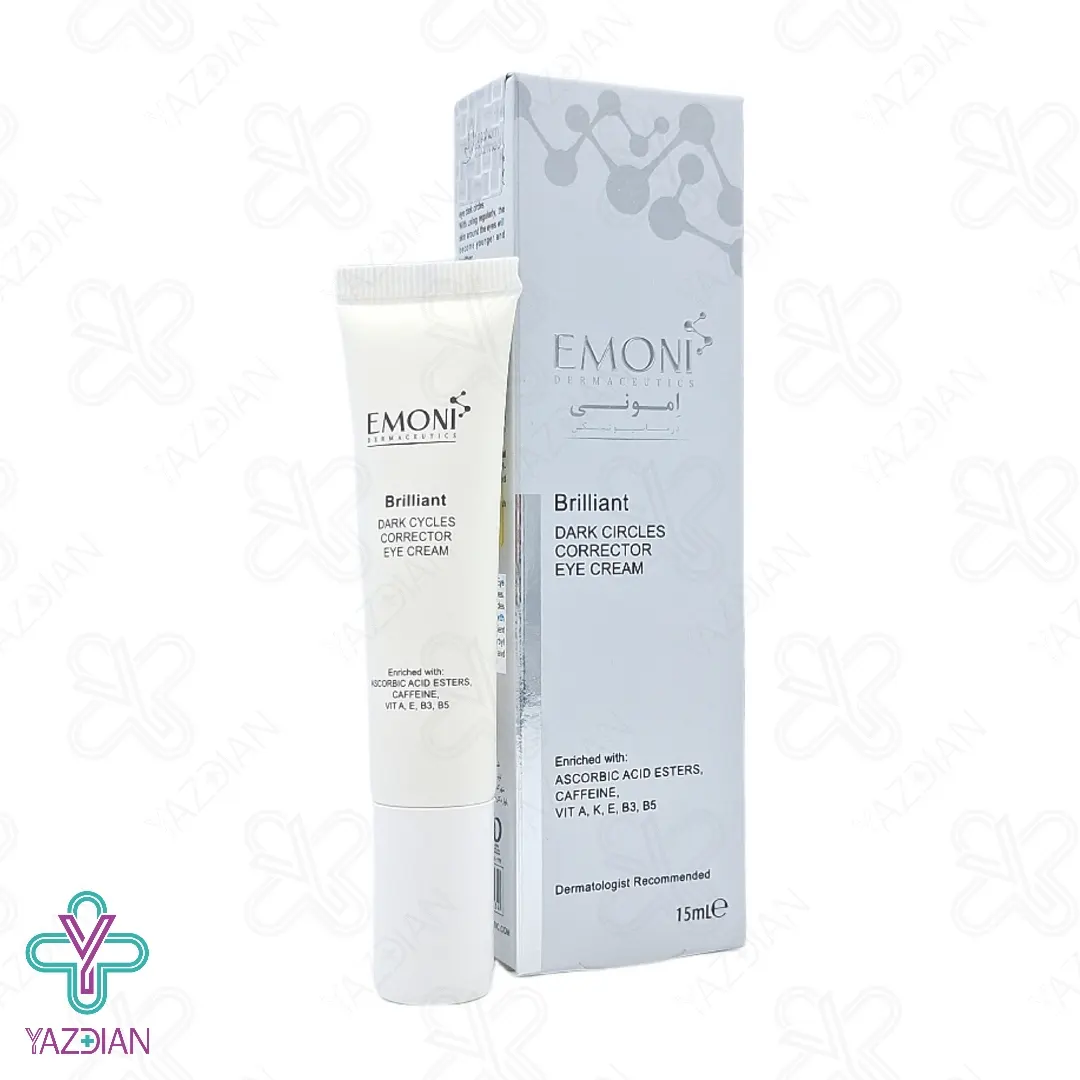 کرم ضد تیرگی و پف دور چشم امونی - 15 میلی لیتر (Emoni Briliant Dark Circles Corrector Eye Cream ۱۵ ml) از دسته محصولات روشن کننده و ضد لک می باشد که با بهره گیری از توکوفرول، رتینیل پالمیتات، نیاسینامید، روغن هسته انگور، گلوکونولاکتون، کافئین، استرهای ویتامین C و ویتامینهای B۳ و B۵ از بین برنده عالی سیاهی های دور چشم می باشد که پوست دور چشم را شفاف و روشن می سازد.