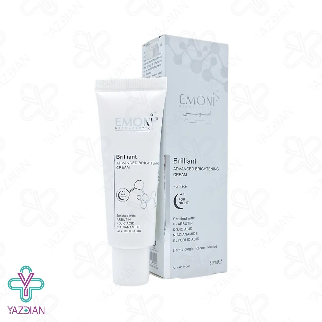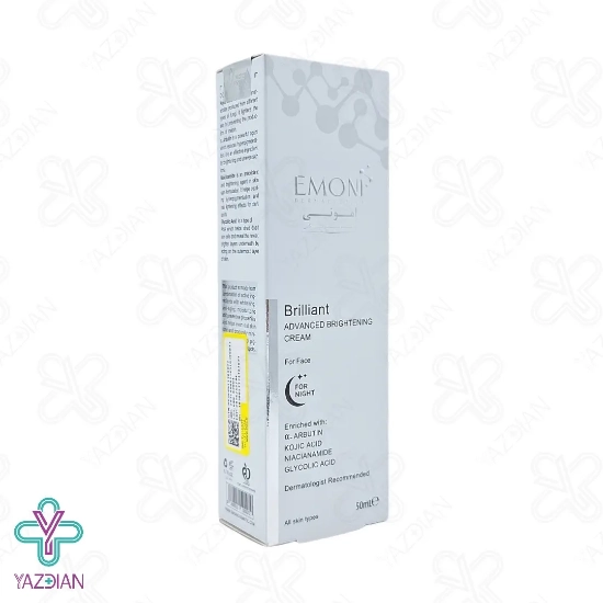 کرم ضد لک شب برلیانت امونی - 50 میلی لیتر (Emoni Brilliant Advanced Brightening Cream ۵۰ Ml) یک کرم ضد لک قوی می باشد که از بین برنده نقاط تیره پوست می باشد که پوست را صاف، یک دست و بی نقص نشان می دهد. بعلاوه خاصیت مرطوب کنندگی نیز داشته و از خشکی و دهیدراته شدن پوست جلوگیری می کند. با توجه به این که کرم ضد لک شب برلیانت امونی طراحی شده برای استفاده در شب می باشد، طی شب پوست را ترمیم و بازسازی می کند.