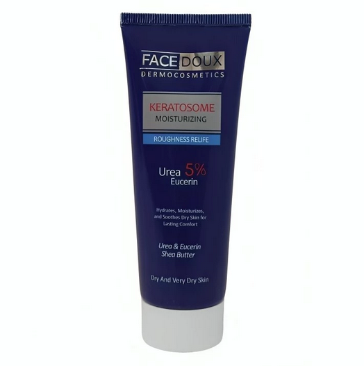 کرم مرطوب کننده و نرم کننده اوسرین اوره 5% کراتوزوم فیس دوکس (Eucerin Urea 5% Keratosome face Doux Miosturizing and softening cream - 75 ml) یک محصول مناسب جهت رفع خشکی پوست می باشد این محصول با دارا بودن ترکیباتی موثر موجب مرطوب و نرم شدن پوست می شود اوره موجود در این محصول یک مرطوب کننده طبیعی می باشد که رطوبت محیط را جذب کرده و موجب حفظ آب در پوست می شود و هم چنین با لایه برداری ملایم موجب نرم شدن پوست خشک و خشن می شود اوره هم چنین با تقویت سد دفاعی پوست موجب باز سازی سد محافظتی پوست شده و در برابر عوامل آسیب زا مانند سرما، خشکی و شوینده ها مقاومت می کند و با دارا بودن خاصیت ضد التهابی خارش، سوزش و تحریکات ایجاد شده در اثر خشکی بیش از حد پوست را تسکین می دهد اوسرین موجود در این محصول که یک ترکیب مشتق شده از وازلین می باشد یک مرطوب کننده و محافظ پوست بوده و با ایجاد یک لایه محافظ بر روی پوست مانع از تبخیر رطوبت طبیعی پوست می شود و با ساختار چرب و غلیظ خود موجب نرم و لطیف شدن پوست می شود کرم مرطوب کننده فیس دوکس هم چنین دارای ترکیباتی شامل آلفا توکوفرول، لانولین، روغن بادام شیرین، شی باتر و گلیسرین می باشد.
