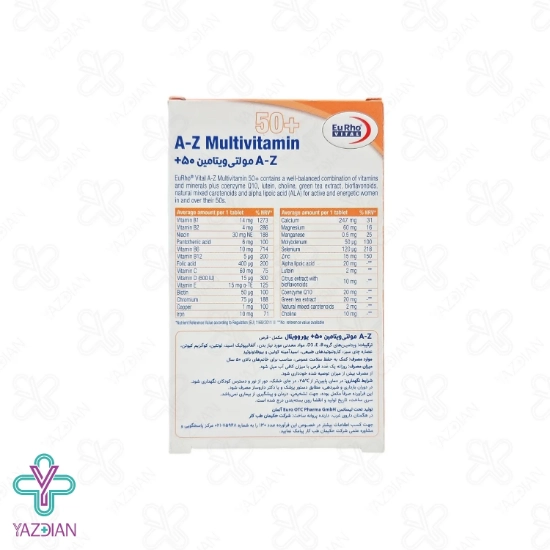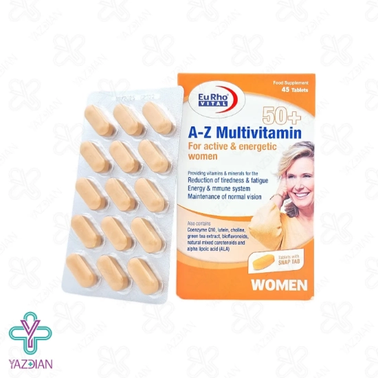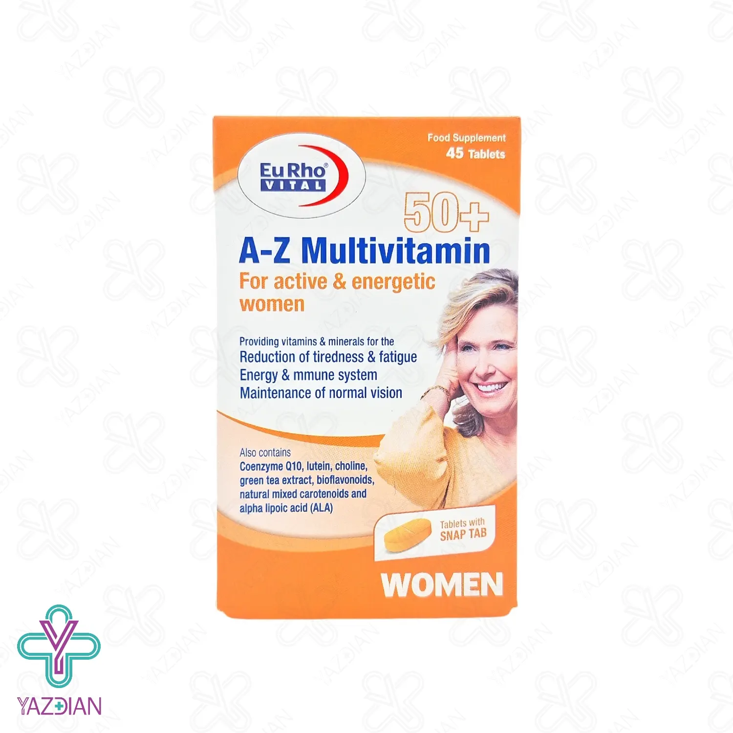 قرص مولتی ویتامین بانوان بالای 50 سال یوروویتال - 45 عددی (Eurho Vital A Z Multivitamin 50+ For Women 45 Tabs) یکی از بهترین مولتی ویتامین های موجود در داروخانه هاست که با غنی بودن از ریز مغذی ها و ویتامین های لازم بدن، کلیه نیاز های بدن به به مینرال ها، عناصر کمیاب و ویتامین های لازم بدن را تامین کرده و سلامت عمومی بدن را حفظ می کند.